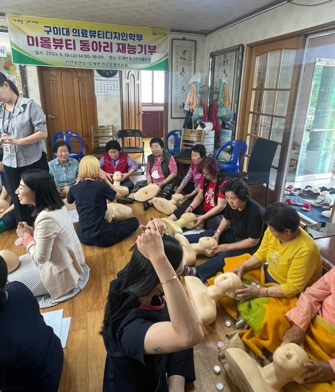 선산보건소는 19일 도개면 동산리 건강마을 경로당에서 구미대학교 의료뷰티디자인학부‘미올뷰티동아리’10여명의 학생들이 주민들에게 피부관리 재능기부를 하는 시간을 가졌다.