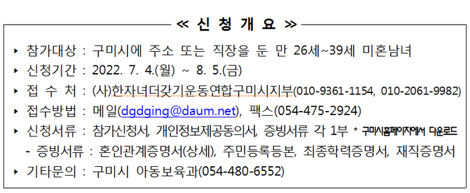 신청대상은 구미시에 주소를 두고 있거나 직장을 둔 만 26세~39세 미혼남녀로 참가신청서와 혼인관계증명서(상세), 주민등록등본, 재직증명서, 최종학력증명서 등 구비서류를 (사)한자녀더갖기운동연합 구미시지부(dgdging@daum.net)로 신청하면 된다.