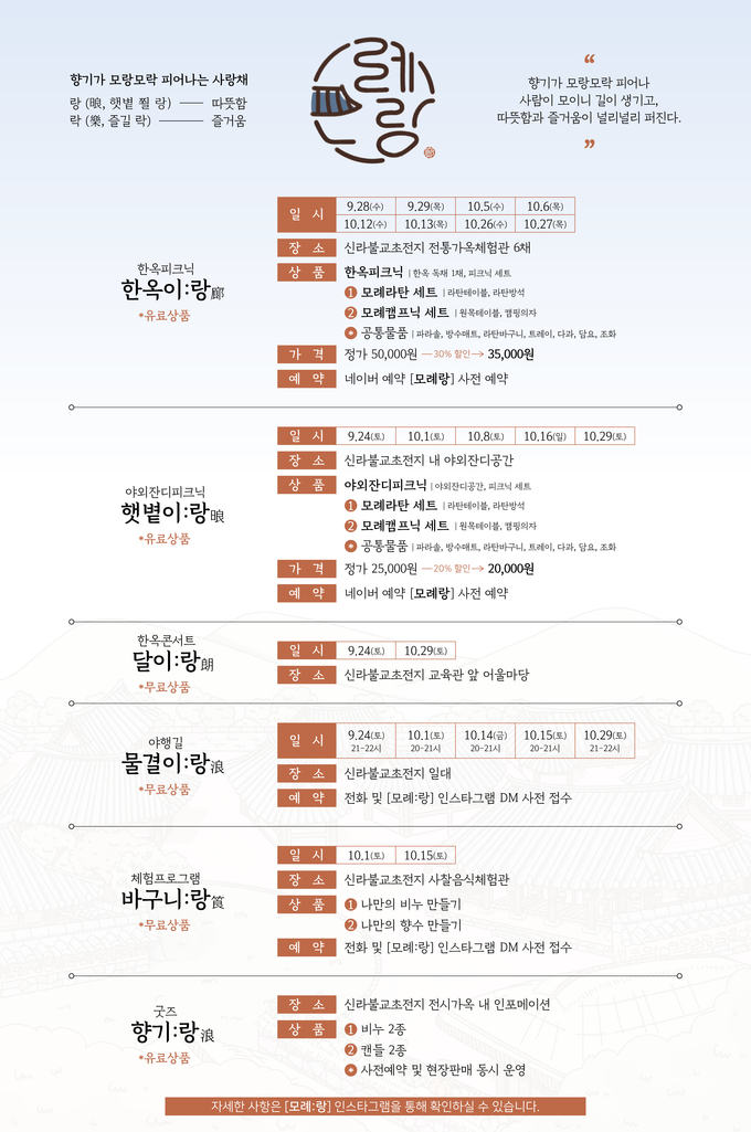 올 가을「모례:랑」프로그램 운영으로 이전까지 신라불교초전지에서 즐길 수 있었던 체험 콘텐츠를 보강할 수 있는 계기가 되고 관광객들의 다양한 관광 수요를 충족시켜 경쟁력 있는 3대문화권 사업장으로 거듭날 수 있을 것으로 기대된다. 「모례:랑」프로그램의 자세한 정보는 모례:랑 공식 SNS(네이버예약 “모례랑”, 인스타그램 @morye._.and)을 참고하거나 전화(☎054-451-0414)로 문의가 가능하다.