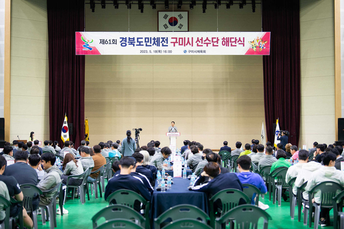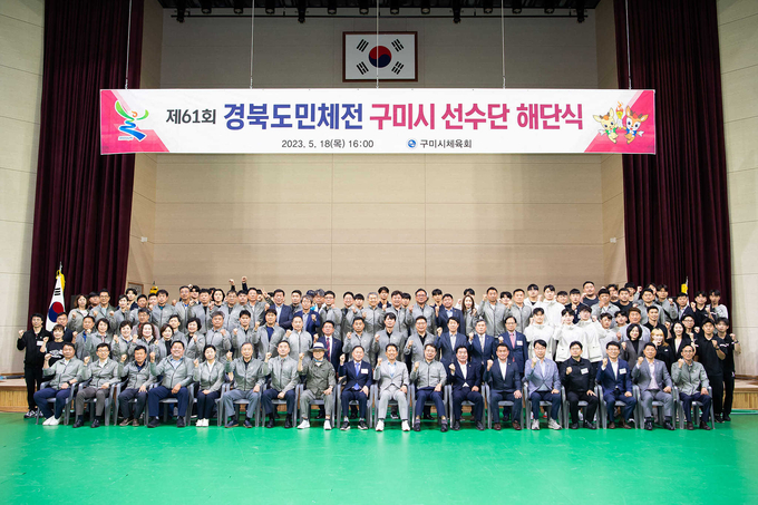 구미시(시장 김장호)는 5월 18일(목) 오후 4시 구미시복합스포츠센터 2층 다목적체육관에서 도·시의원, 기관단체장, 관내 학교장 및 체육회 임원, 선수 등 350여명이 참석한 가운데 구미시체육회 주관으로 『제61회 경북도민체육대회』구미시선수단 해단식을 개최하였다.