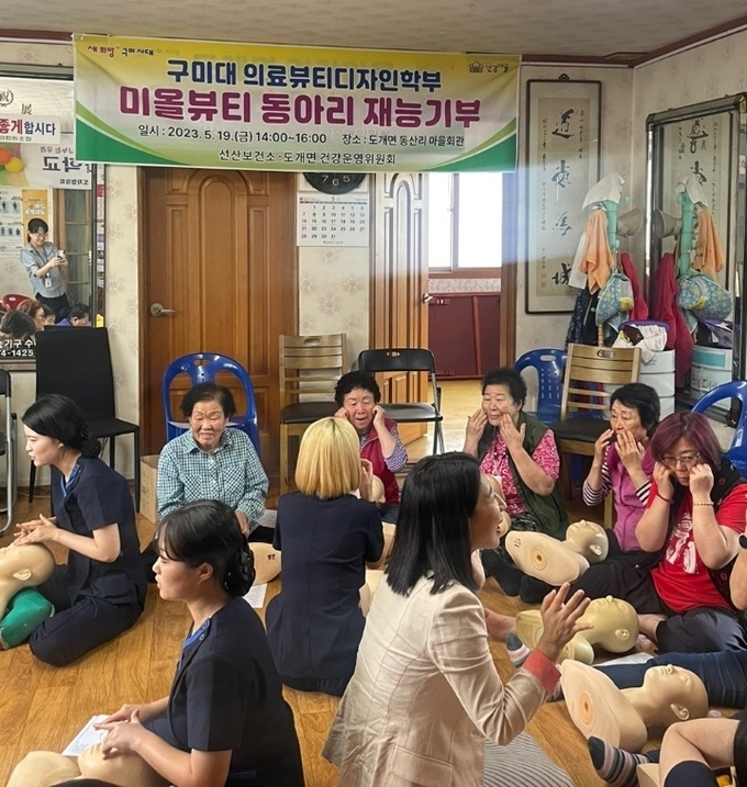 선산보건소는 19일 도개면 동산리 건강마을 경로당에서 구미대학교 의료뷰티디자인학부‘미올뷰티동아리’10여명의 학생들이 주민들에게 피부관리 재능기부를 하는 시간을 가졌다.