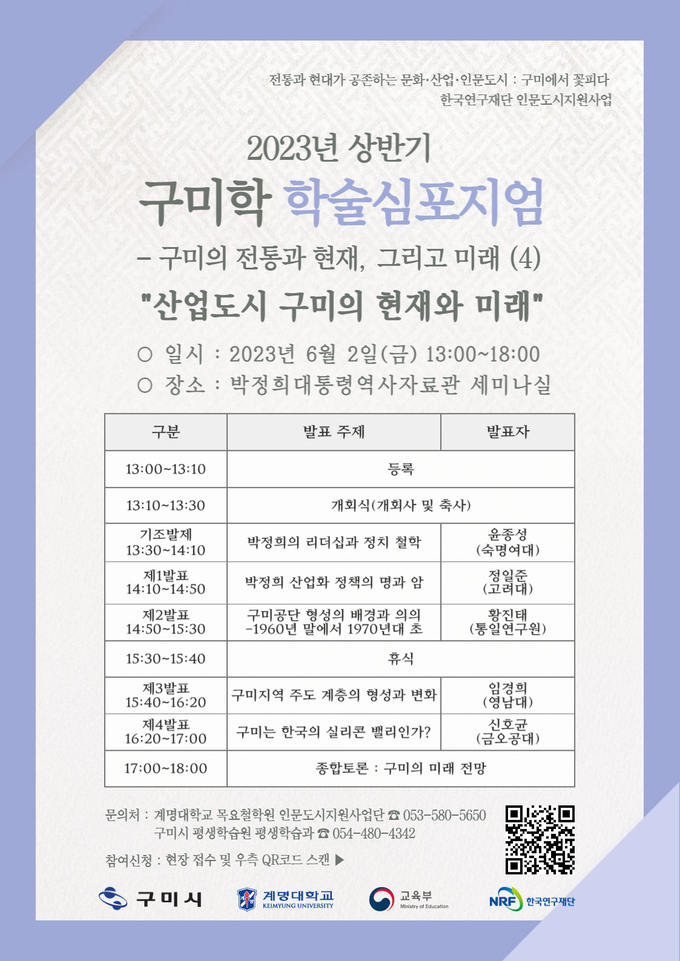 산업도시 구미에 관한 심도 있는 토론을 통해 우리 지역의 역사, 문화, 사회적 정체성을 형성하는 구미학 구축에 있어 이론적 토대를 마련하는 뜻깊은 자리가 될 것이다.