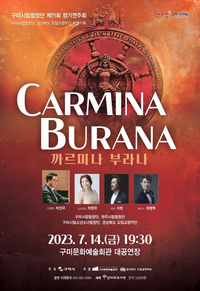 구미시는 14일 문화예술회관 대공연장에서 제71회 구미시립합창단 정기공연「까르미나 부라나(Carmani Burana)」를 개최한다.