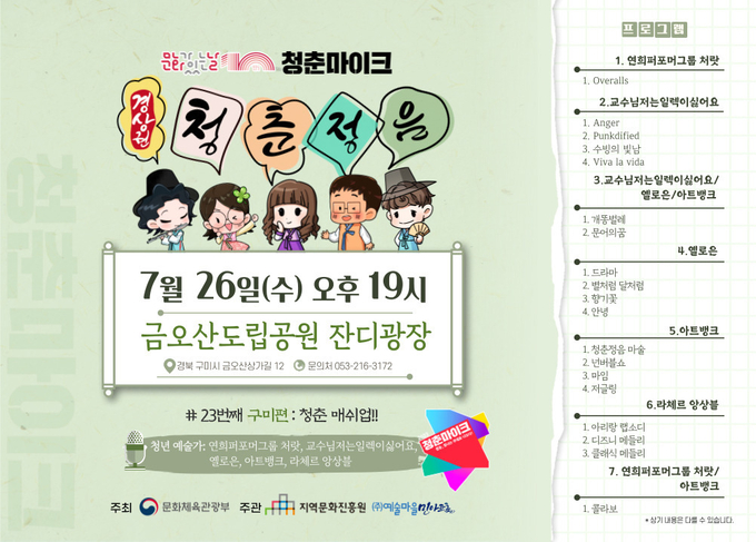 구미시는 26일 금오산 분수광장에서 2023년 문화가 있는 날 '청춘마이크' 경상권 공연을 개최한다.
