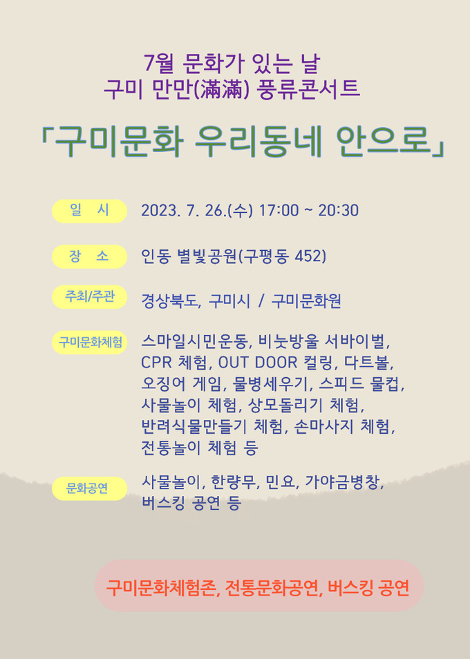 구미시는 26일 별빛공원(구평동 소재)에서 구미문화원(원장 라태훈) 주관으로 7월 문화가 있는 날 「구미 만만(滿滿) 풍류 콘서트 - 구미문화 우리 동네 안으로」를 개최한다.