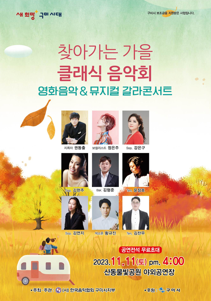 구미시는 11일 산동 물빛 공원 야외공연장에서 (사)한국음악협회 구미시지부(대표 권동출) 주관으로 찾아가는 가을 클래식 음악회를 개최한다.