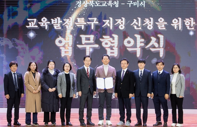구미시는 23일 경상북도교육청 웅비관에서 이철우 경북 도지사, 임종식 경북도교육청 교육감, 도내 8개 시군(포항, 안동, 상주, 칠곡, 예천, 봉화, 울진, 울릉)이 참여한 가운데 교육발전특구 시범사업 지정 업무협약을 체결했다.