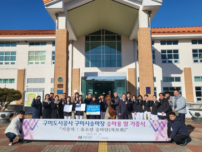 구미도시공사(사장 이재웅) 구미시승마장은 유소년승마단 학부모회(자모회)에게 지난 1월 24일 강습용 마필을 전달받고 기증식을 개최하였다.