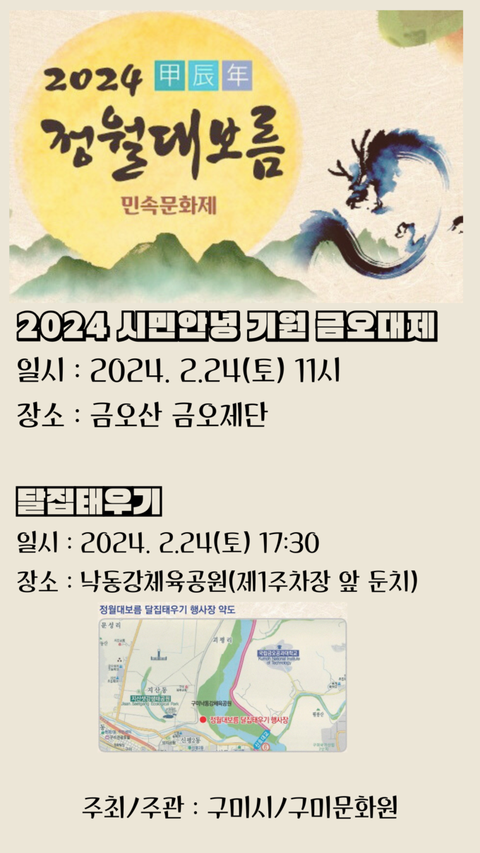 구미시는 오는 24일 2024년 정월대보름을 맞아 한 해의 액운을 떨쳐버리고 시민 안녕 기원과 화합을 도모하는 「2024 갑진년 정월대보름 민속문화제」를 개최한다.