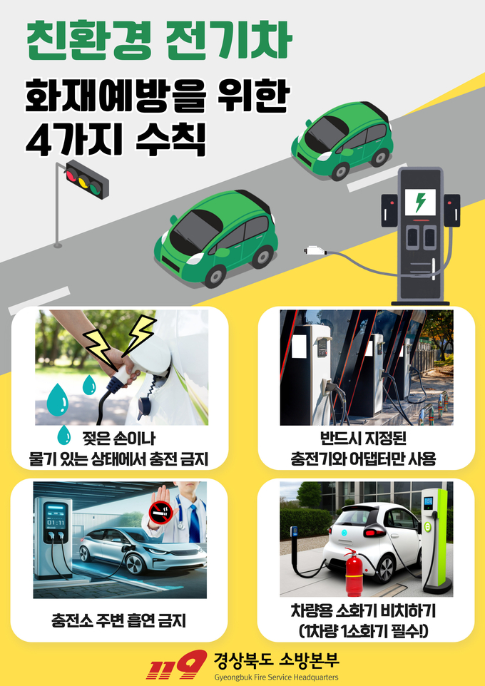 구미소방서(서장 임준형)은 “전기차 충전 중 화재 예방을 위한 안전수칙을 꼭 숙지하고, 충전시설을 정기적으로 점검 해주시길 바란다”고 당부했다.
