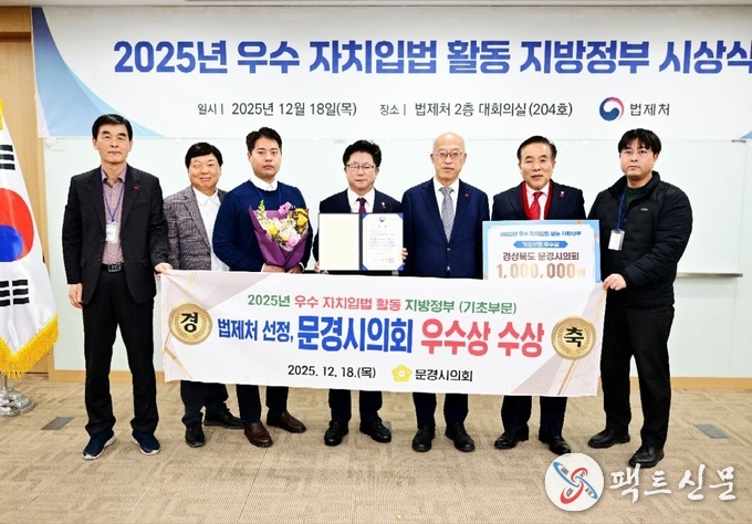 문경시의회(의장 이정걸)는 12월 18일 정부세종청사 법제처에서 열린 ‘2025년도 우수 자치입법 활동 지방정부’시상식에서 우수기관으로 선정돼 법제처장 기관표창을 수상했다.