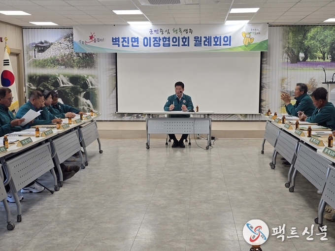 김창구 벽진면장은 “이장님들의 적극적인 협조에 항상 감사드린다”며, “회의에서 건의된 소중한 의견들은 행정에 적극 반영하여 ‘더 살기 좋은 벽진면’을 만드는데 최선을 다하겠다”고 말했다.