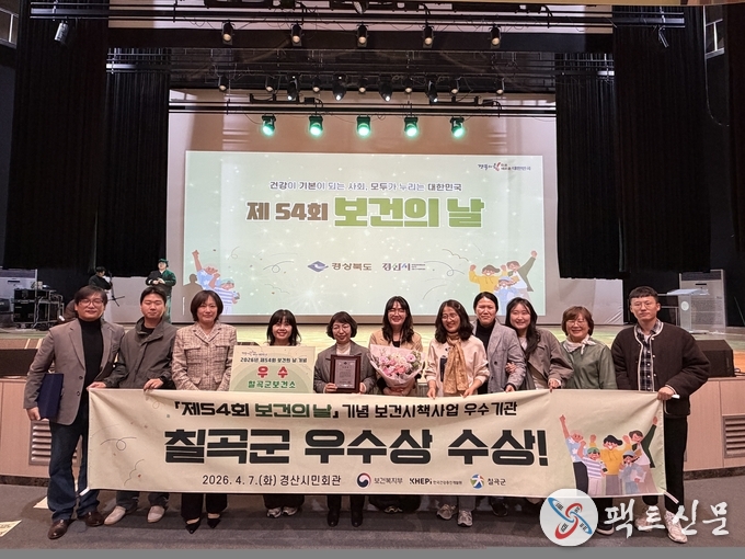 칠곡군은 지난 4월 7일 경산시민회관 대강당에서 열린 경상북도 주최 "제54회 보건의 날”기념행사에서‘우수상'을 수상했다. 이번 수상으로 2023년부터 올해까지 4년 연속 수상하는 영예를 안았다.