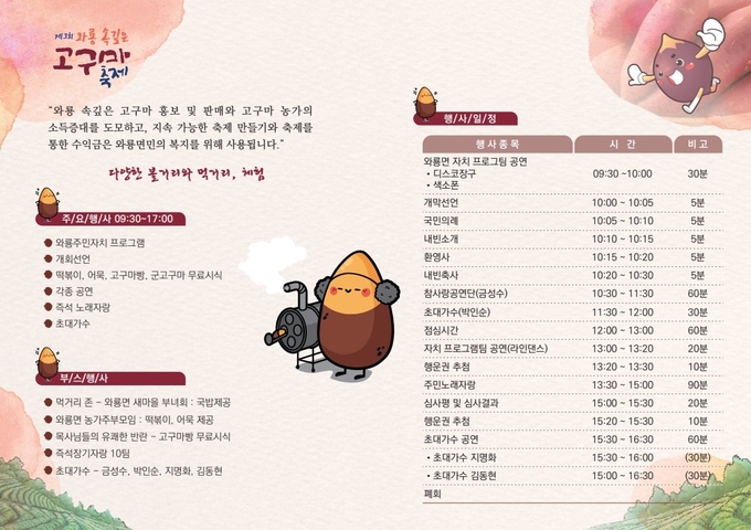 와룡면 지명숙 주민자치위원장은 “지역민들이 땀 흘려 준비한 축제로, 와룡 고구마의 우수성을 알리고 지역민이 화합하는 장이 되길 기대한다”며, “특히 올해는 더욱 풍성해진 먹거리와 행운권 추첨으로 방문객들에게 깊은 가을의 추억을 선물하겠다”고 밝혔다.