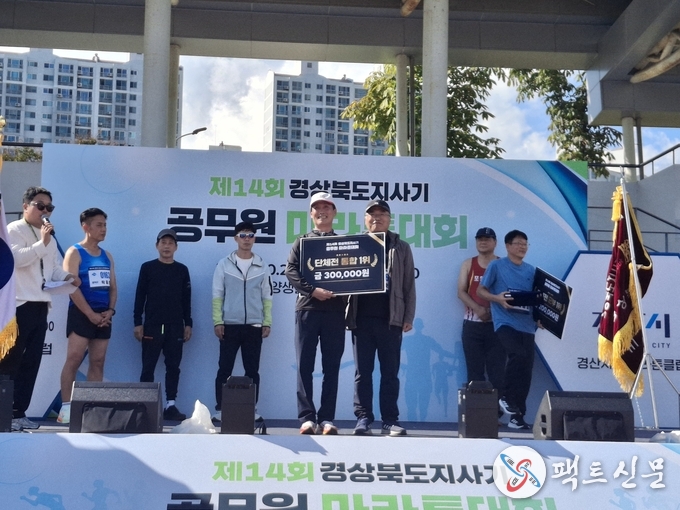 구미시청 마라톤 동호회가 지난 지난 25일 경산 하양생활체육공원에서 열린 「제14회 경상북도지사기 공무원마라톤대회」에서 지난해에 이어 단체전 통합우승을 차지했다