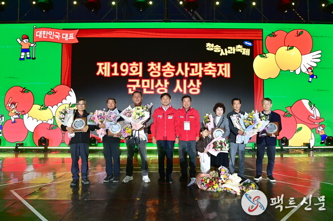 또한 축제 기간 중 열린 사과왕 시상식과 군민상 시상식이 축제의 의미를 한층 더했다. 사과왕 시상식에서는 ▲사과왕 조용태(안덕면) ▲우수상 김창율(부남면) ▲장려상 정무상(현서면) ▲황금진 도재범(안덕면) 씨가 수상의 영예를 안았으며, 군민상 시상식에서는 ▲임윤기(주산지리 이장) ▲권오영(신기2리 이장) ▲남법식(현동면체육회 부회장) ▲김영조(부남면 지역사회보장협의체 민간위원장) ▲권영선(바르게살기운동청송군협의회 회장) ▲권태욱(명성 TNS 전 대표) 씨가 수상했다.