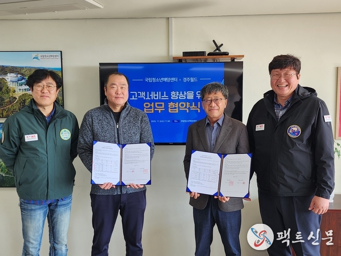 국립청소년해양센터(원장 조경래, 이하 해양센터)는 5일(수)에 ㈜경주월드(대표이사 정원기)와 ‘청소년 체험활동 및 지역관광 활성화를 위한 업무협약’을 체결하였다.
