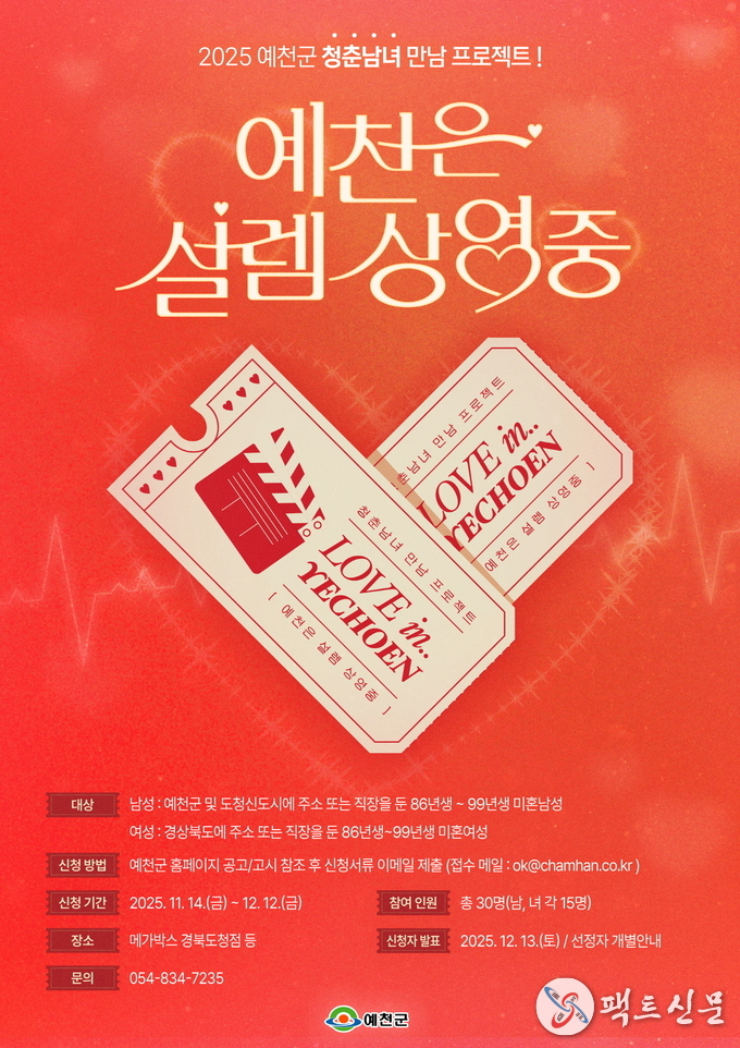 예천군(군수 김학동)은 14일부터 12월 12일까지 청춘남녀 만남행사 ‘예천은, 설렘 상영 중’ 참가자를 모집한다.