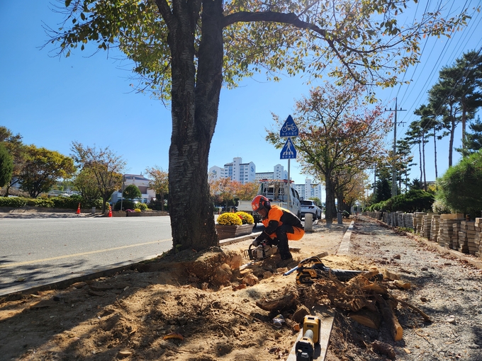 군은 이번 사업을 통해 가로수의 생육에 영향을 미치지 않는 범위 내에서 돌출된 뿌리를 절단(단근)하고, 절단된 뿌리 부분의 감염과 수분 손실을 방지하고자 상처 보호제를 도포하는 공사를 추진했다. 또한 교통표지판 시야를 가리거나 통행에 방해가 되는 낮은 가지를 제거하는 전정작업도 함께 시행해 보행환경 개선 효과를 높였다.