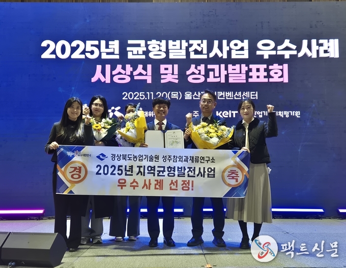 경상북도는 20일 대통령 직속 지방시대위원회가 주관한 ‘2025년 지역균형발전사업 우수사례 시상식’에서 경상북도농업기술원 성주과채류연구소가 지역농업연구기반 및 전략작목육성(R&D) 지원계정 부문 우수사례로 선정돼 우수 기관상을 받았다.