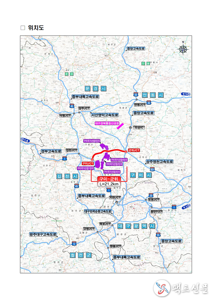 구미~군위 고속도로는 구미에서 군위군 효령면(중앙고속도로)까지 총 21.2km 구간을 4차로로 신설하는 사업으로, 사업비는 약 1조 5,627억 원 규모다. 이는 1970년 경부고속도로 이후 55년 만에 구미를 통과하여 동서를 잇는 첫 고속도로라는 점에서 의미가 크다.