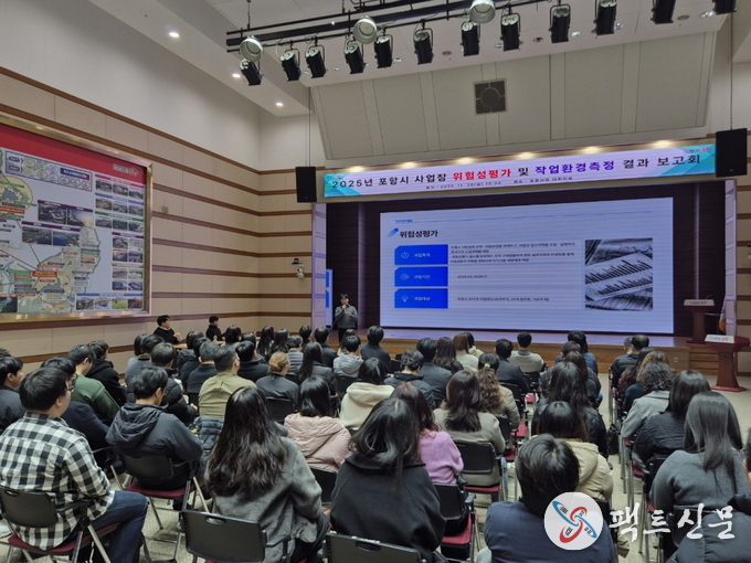 포항시는 28일 시청 대회의실에서 시 직영 사업장의 관리감독자와 사업 담당자 등 100여 명이 모인 가운데 ‘2025년 포항시 사업장 위험성평가 컨설팅 및 작업환경측정 용역 결과 보고회’를 개최했다.