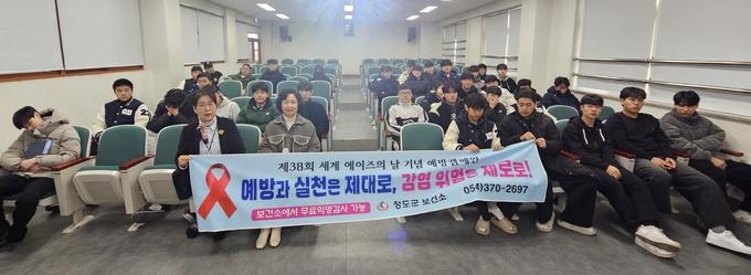 청도군(군수 김하수)은 제38회 세계 에이즈의 날(12월 1일)을 맞아, 지난 2일(화) 풍각면 소재 경북드론고등학교, 청도읍 소재 청도 고등학교 3학년 재학생 145명을 대상으로 에이즈 예방 교육을 실시하였다.