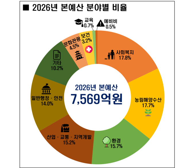 김하수 청도군수는 4일 열린 제314회 청도군의회 제2차 정례회 시정연설을 통해 민선 8기 마지막 해인 2026년을 ‘도약과 완성의 해’로 선언하며, 아이들의 웃음이 이어지고, 청년의 도전이 꽃피며, 어르신의 일상이 더 안전해지는 청도를 만들겠다는 군정운영 방향을 밝혔다. 청도군이 제출한 2026년도 예산안은 올해보다 21.88% 증가한 역대 최대 규모인 총 7,569억 원으로 편성되었으며, 이는 일반회계 6,828억 원, 특별회계 741억 원 규모이다. 이 예산은 민생 안정, 복지 확대, 농업 대전환, 정주기반 강화, 문화관광 인프라 확충에 중점적으로 투입될 계획이다.