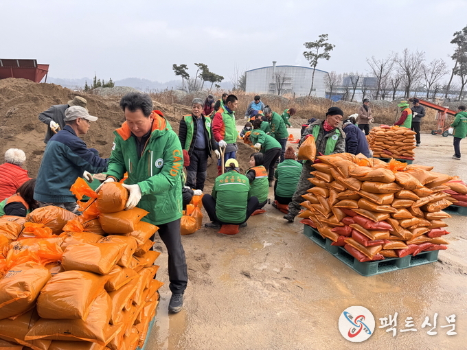 문경시 자율방재단(단장 정영석)은 다가오는 겨울철 폭설·한파로 인한 도로결빙 및 미끄럼 사고를 예방하기 위해 단원 60여 명이 일손을 보태 모래주머니 2,000개를 제작했다.