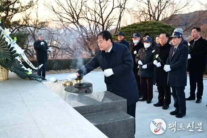 신년참배는 2026년 김천시의 안녕을 기원하고 새로운 도약에 대한 각오와 의지를 다지는 중요한 행사로, 이날 행사는 김천시장을 비롯한 김천시 보훈단체장, 국회의원, 시의원 등이 참석한 가운데 헌화와 분향, 묵념 순으로 진행됐다.