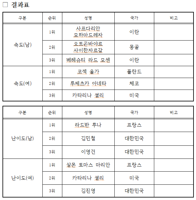 특히 남자 난이도 부문 2위와 3위, 여자 난이도 부문 3위에는 대한민국 선수가 이름을 올려 대한민국이 아이스클라이밍 종목 강국임을 한 번 더 입증하는 계기가 되었다.