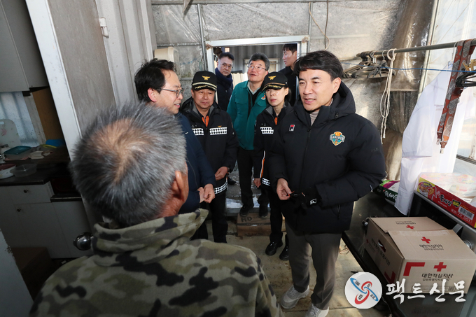 이날 김진태 지사는 겨울철 폭설로 인한 주거용 비닐하우스 붕괴 위험 여부를 점검하고, 거주지 내 난방기기와 소화기 작동상태 등 화재 예방을 위한 안전 점검을 실시했다.
