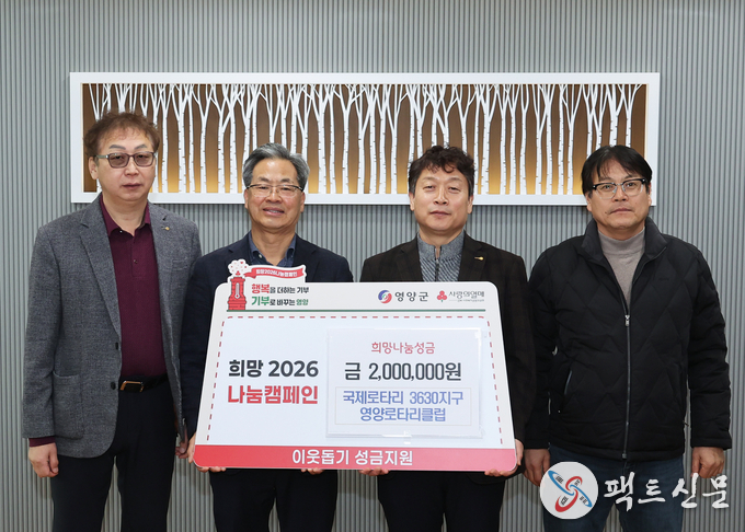국제로타리 3630지구 영양로타리클럽(회장 황영호)은 1월 26일 「희망2026나눔캠페인」에 동참해 지역의 어려운 이웃을 돕기 위한 성금 200만원을 영양군청에 전달했다.
