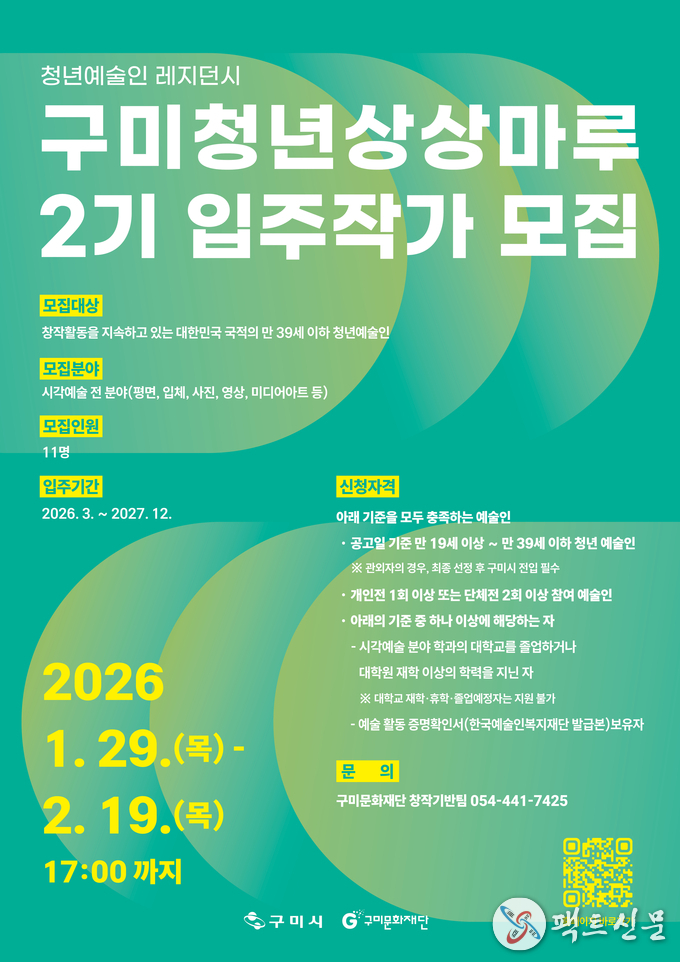 접수 기간은 2월 19일(목)까지이며, 지원을 희망하는 예술인은 관련 서류를 이메일로 제출하면 된다. 모집과 관련한 자세한 사항은 구미문화재단 홈페이지(www.gucf.or.kr)를 통해 확인할 수 있다.