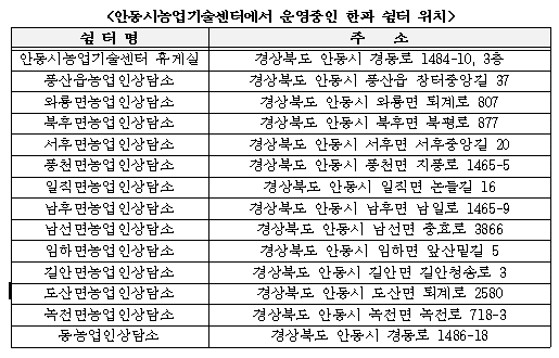 안동시농업기술센터는 최근 기습적인 한파로 인한 한랭질환자가 급증함에 따라 한파 피해 예방을 위한 한파쉼터 14개소를 운영 중이다.
