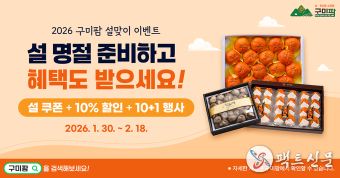 구미시가 운영하는 농특산물 온라인쇼핑몰 구미팜이 설명절을 맞아 소비자를 위한 설맞이 특별 할인 행사를 1월 30일부터 2월 18일까지 진행한다.