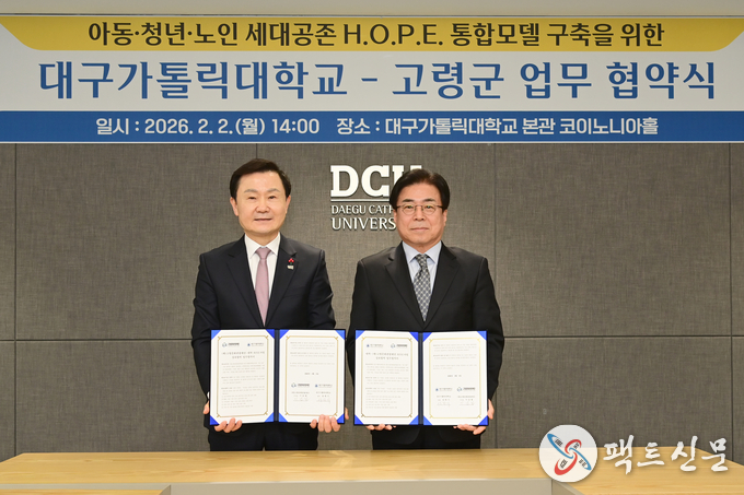 고령군은 2월 2일 대구가톨릭대학교와 함께 경상북도 지역혁신중심 대학지원체계(RISE)사업의 일환으로「경북 U-Care 맞춤돌봄서비스」추진을 위한 업무협약을 체결했다고 밝혔다.