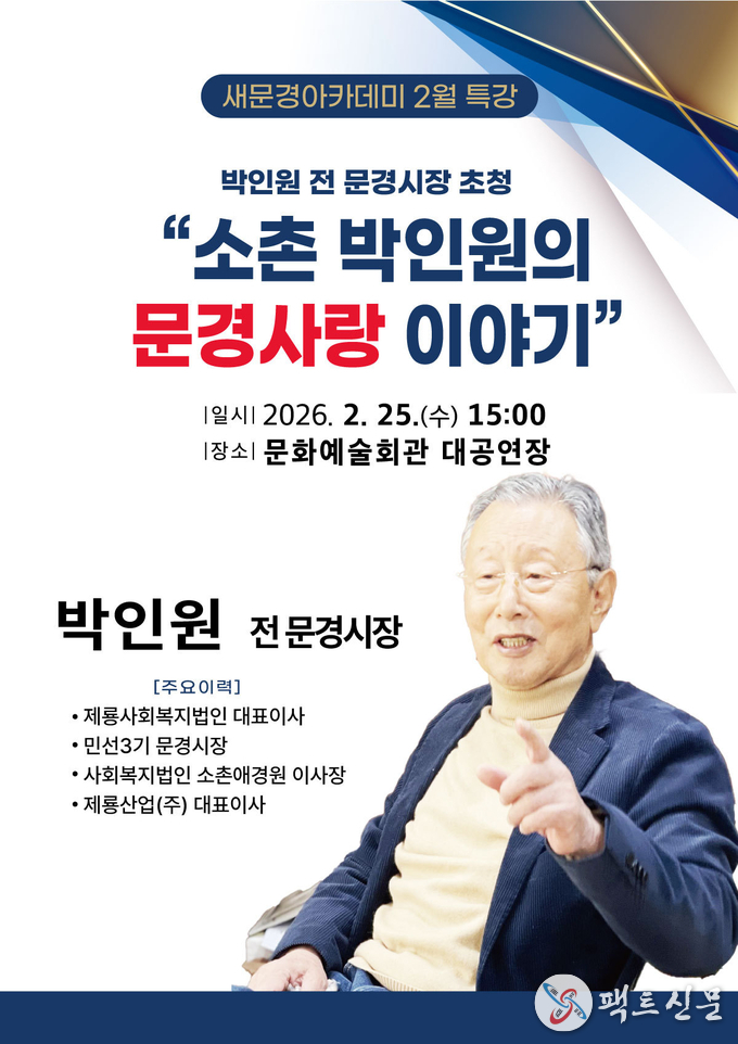 이번 특강은 박인원 전 문경시장을 초청하여 「소촌 박인원의 문경사랑 이야기」를 주제로 진행되며, 대담 형식으로 운영된다.