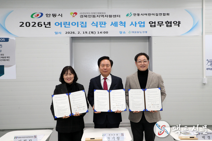 안동시는 2월 19일(목) 2026년 어린이집 식판 세척사업의 원활한 추진을 위해 경북안동지역자활센터, 안동시어린이집연합회와 업무협약을 체결했다. 이날 협약식에는 권기창 안동시장을 비롯한 관계자들이 참석해 영유아 건강 보호와 보육환경 개선, 지역 일자리 창출을 위한 협력체계 구축을 약속했다.