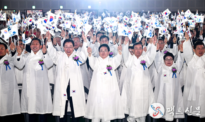 기념식은 개식 선언을 시작으로 국민의례, 독립선언서 낭독, 유공자 표창 수여, 기념사, 3·1절 노래 제창, 만세삼창 순으로 엄숙하게 진행됐다. 특히, 국민의례 중 애국가 제창 순서에서는 이 지사와 도청 간부 공무원들이 직접 무대에 올라 함께 제창했다.