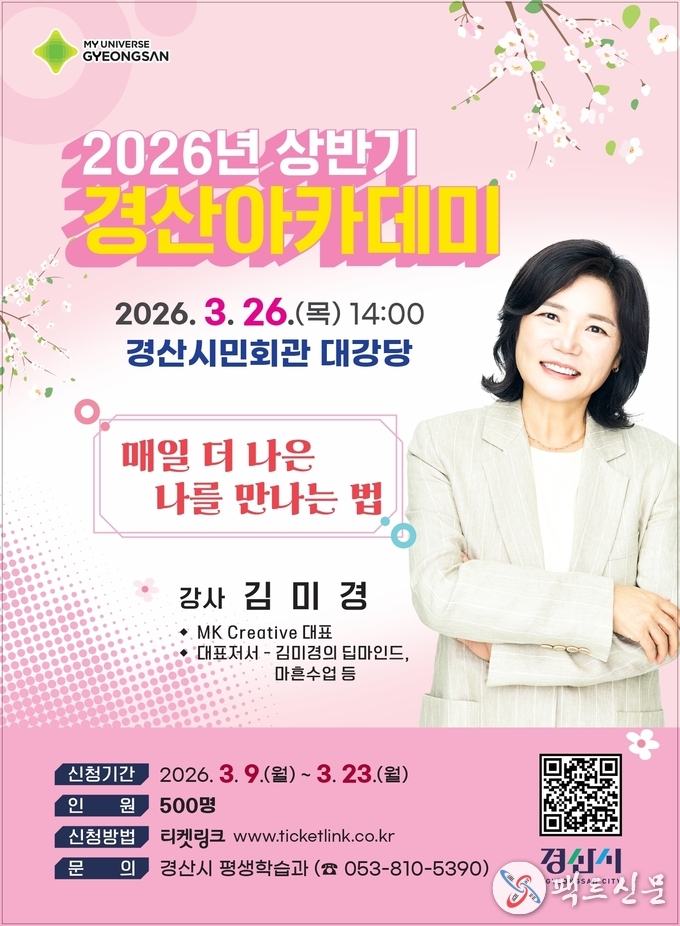 경산시(시장 조현일)는 26일 경산시민회관 대강당에서 『2026년 상반기 경산 아카데미』를 개최할 예정이다. 이번 특강은 MK Creative 대표 김미경 강사를 초청해‘매일 더 나은 나를 만나는 법’을 주제로 진행될 예정이다.