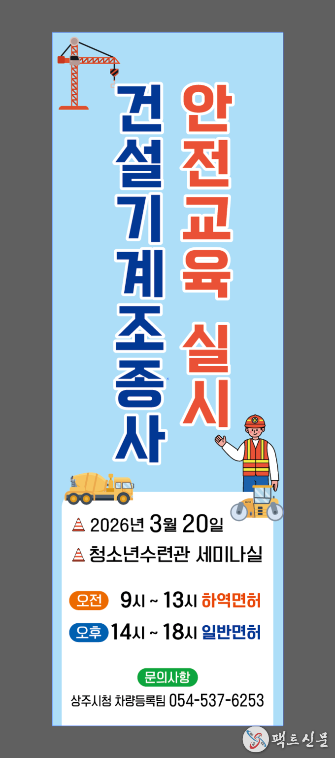 상주시는 오는 20일 청소년수련관 세미나실에서 2026년 건설기계조종사 안전교육을 실시한다.
