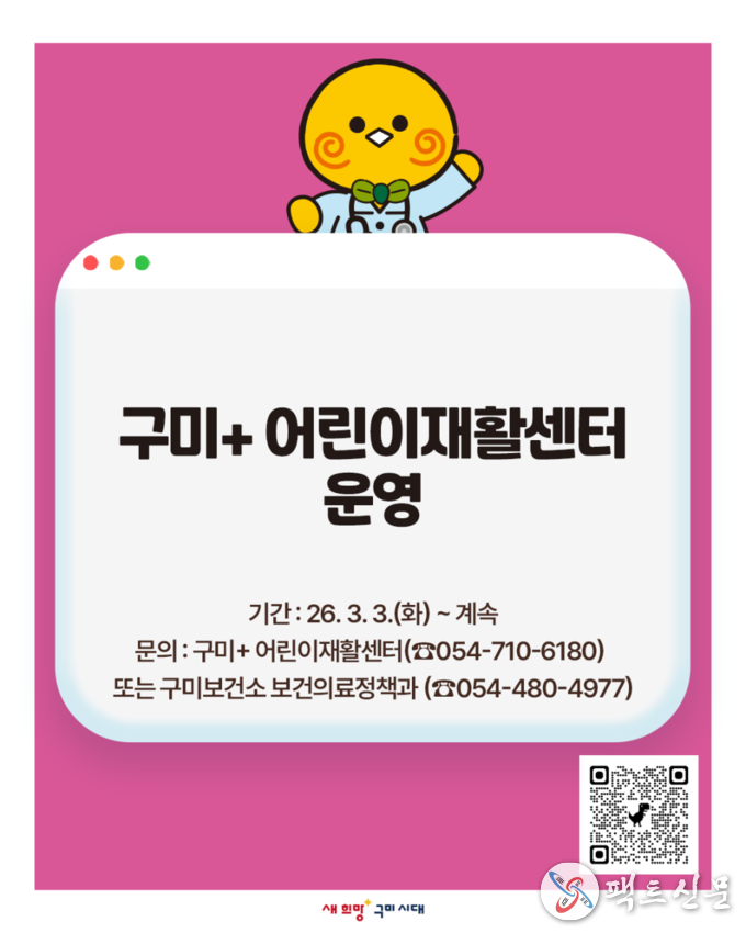 김장호 구미시장은 “어린이 재활치료는 성장과 발달의 결정적 시기에 지속적으로 이뤄져야 한다”며 “구미+ 어린이재활센터를 통해 지역에서도 전문적인 치료가 가능해진 만큼, 소아 필수의료 체계를 더욱 촘촘히 구축해 나가겠다”고 말했다.