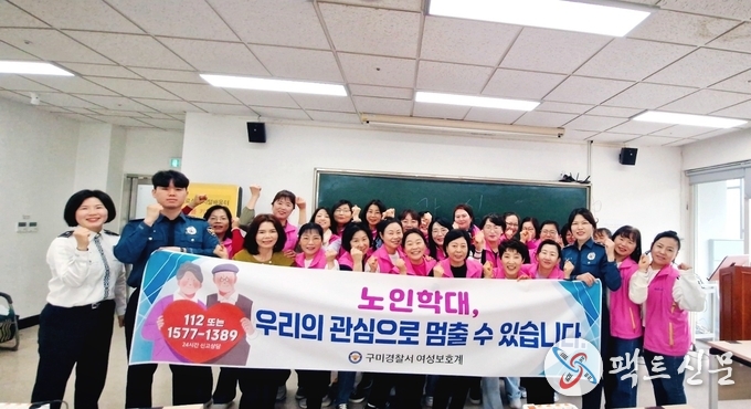구미경찰서(서장 유오재)는 30일 대한노인회 구미시지회에 여성보호계장, 학대예방경찰관(APO), 교통홍보 담당자가 방문하여, 경로당에 서비스를 제공하는 “행복선생님” 25명을 대상으로 노인학대 예방 교육 및 조기 발견을 위한 간담회를 개최했다.