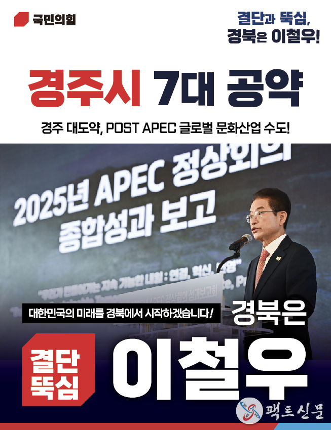이어 “역사와 문화, 에너지와 산업, 관광과 시민의 삶이 함께 성장하는 구조를 만들어야 진정한 경주 대도약이 완성된다”며 “APEC을 직접 유치하고 성공시킨 경험과 역량을 바탕으로 경주의 잠재력을 모두 현실로 만들겠다”고 강조했다.