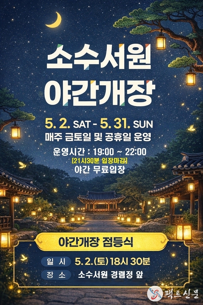 이번 야간개장은 5월 2일부터 31일까지 매주 금·토·일요일과 공휴일에 진행되며, 해당 기간 동안 방문객들은 무료로 야간 관람을 즐길 수 있다.