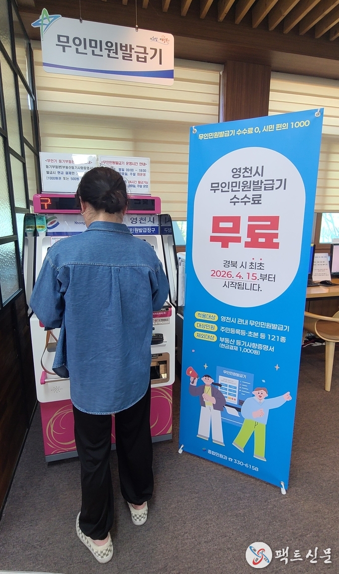 이에 따라 영천시민을 포함한 이용자 누구나 무인민원발급기를 통해 주민등록등·초본, 가족관계증명서, 토지대장, 건축물대장, 지방세 증명 등 총 121종의 민원 서류를 수수료 없이 발급받을 수 있다. 다만, 법원 소관 업무인 부동산 등기사항증명서는 면제 대상에서 제외돼, 기존과 동일하게 1,000원의 수수료를 납부해야 한다.