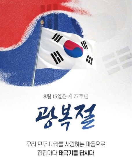권기창 안동시장은 “제77주년 광복절을 맞아 올바른 게양과 관리를 통해 나라 사랑하는 마음을 드높이고, 각 가정뿐만 아니라 유관기관·민간단체에서도 국가상징인 태극기 달기 운동에 적극 동참해주길 당부한다.”라고 밝혔다.