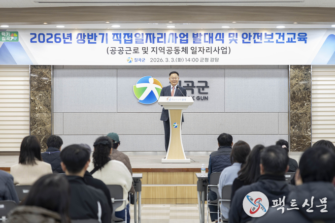 칠곡군은 지난 3월 3일 군청 강당에서 ‘2026년 상반기 직접일자리사업’ 발대식을 진행하고 안전보건교육을 실시했다.