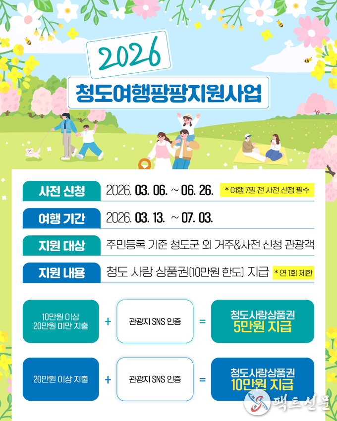 지원 대상은 청도군 외 지역에 주소를 둔 관광객이며, 신청은 오는 3월 6일(금)부터 6월 26일(금)까지 진행된다. 참여를 원하는 관광객은 여행 예정일로부터 최소 7일 전까지 청도군 홈페이지(문화관광-청도여행상품-청도여행팡팡지원-지원신청)를 통해 반드시 사전 신청을 완료해야 한다.